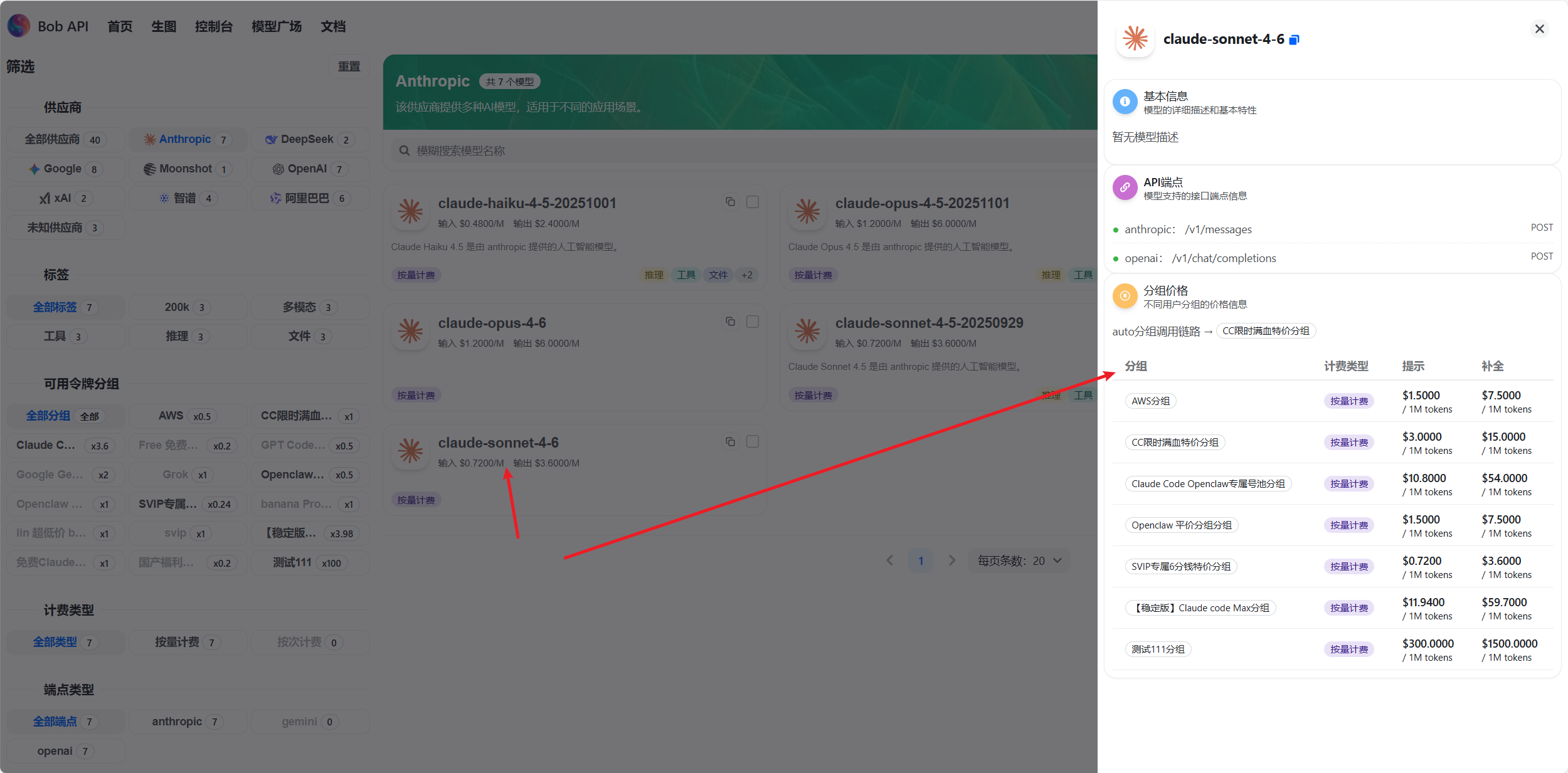 在令牌管理中创建一个令牌,在选择分组的时候要注意,需要用什么模型,就要去模型广场里找到对应的模型,打开看包含这个模型的分组。