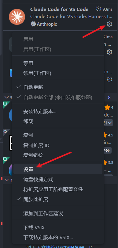 在vscode拓展中查找Claude Code for VS code,打开这个拓展的设置